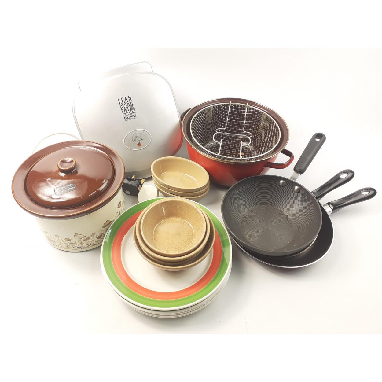 A mixed box of kitchen ware to include a GEORGE FOREMAN grill, a compact slow cooker, chip pan, frying pans, and some flatware. All in good, clean condition