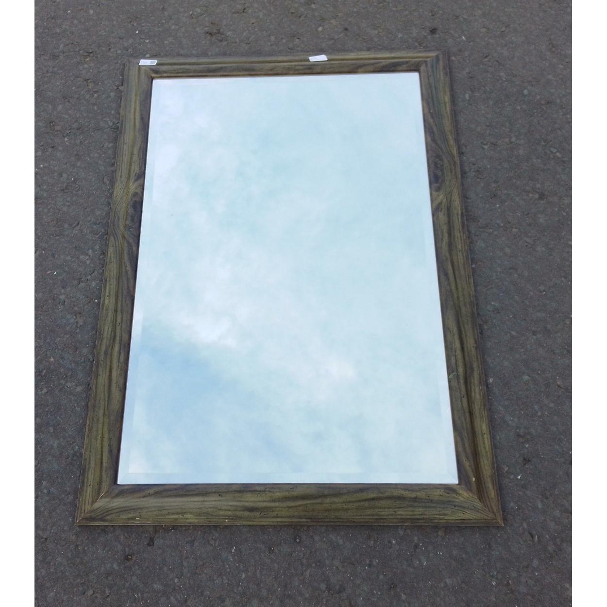 A rather lovely modern bevelled mirror in an aged wooden frame frame size 106cm x 73cm approx, in lovely condition