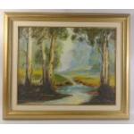 GABRIELE BARNETT An original art piece by this South African born, Scottish Borders based artist. Lovely study of idyllic glade scene with stream running through trees. Warm and accomplished. Oil on canvas. Well framed. Measures 65cm x 55cm approx.