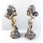 After AUGUSTE MOREAU. A pair of spelter and metal figures depicting cherubs holding vases. Damage to wings, some parts retained. Each standing 25cm tall approx.