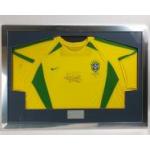 IDEAL XMAS GIFT! - A framed BRAZIL football strip signed by RONALDO. Frame size 87 x 62cm approx. Comes with certificate of authenticity attached to back of frame.