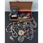 A lined jewellery box containing a very attractive collection of costume jewellery to include beads, brooches, bangles etc. A nice lot of quality items.