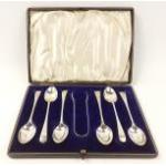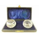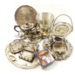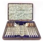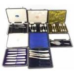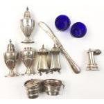 A quantity of blue based costume jewellery including beads, necklaces etc and a cased plated condiment set