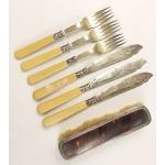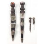 A pair of small children's size Scottish Highland dress Skean Dhu, Sgian Dubh. One plain topped the other with Cairngorm. Each with spaces for cutlery which is completely missing in one and the other with knife and fork but loose fitting. Both blades dirty with minor rust but no damage.