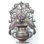 A very pretty vintage 925 stamped brooch with an urn, 2 birds, scroll work and a purple stone, 4cm long gross weight 7g approx