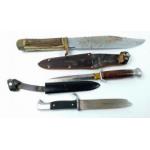A substantial BOWIE knife 40cm, marked Whitby made in Solingen, etched blade has rust pitting, a German scout knife also marked Whitby made in Solingen, blade damaged but with scabbard, and a stiletto knife in sheath
