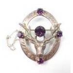 A lovely VINTAGE silver brooch, hallmarked GLASGOW 1954, made by Ward Bros, oval shaped with a stag's head and set with 5 AMETHYST stones and safety chain, 5cm long approx, gross weight 12g approx