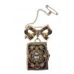 A very pretty decorative 4 panel locket brooch with safety chain suspended from a bow set with a clear stone 5cm long