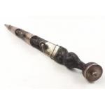 SCOTTISH EDINBURGH KIRKWOOD MAKER INTEREST - silver mounted 19th Century Scottish Highland Dagger Sgian Dubh, by Kirkwood of Edinburgh and Hallmarked 1886. Four bands on the scabbard all hallmarked, the top finial is not. Knife and fork present and in good order but are not marked. Blade fullered with notched top and is in excellent order as is the scabbard. 42cm long. A beautiful piece and uncleaned.