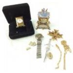 A small lot of costume jewellery and items of interest to include two pretty little gilt clocks, a lovely Maltese cross styled brooch, a plated kilt pin in the shape of a claymore, some gilt spare watch links and a vintage Eterna watch, not currently running etc