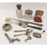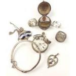 A small silver lot to include a very pretty little case fob watch with floral dial, child's bangle, enamelled pendant, various rings including one in a pretty Muir & Son of Glasgow box, gross weight 55g approx