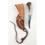 A lovely native NAVAJO style knife in leather sheath. 20cm long with horn handle. Purchased new in Colorado Springs USA in early 2000s. Attractive blue turquoise style band and the whole displays well.