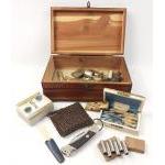 A pretty casket style jewellery box containing various bijouterie - paper knives, vanity case, Swiss Eidelweiss decorated pipe, case musical notation, small quantity of pocket knives, an epaulette and others