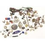 A small mixed lot of jewellery, badges and bijouterie to include base chain with imp medallion, a jet bar brooch, a few military badges, an unmarked propelling pencil and others