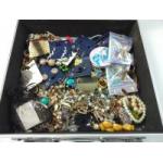 A super twin sided jewellery display suitcase full of interesting costume jewellery to include compacts, beads, necklaces, earrings, and much else of interest