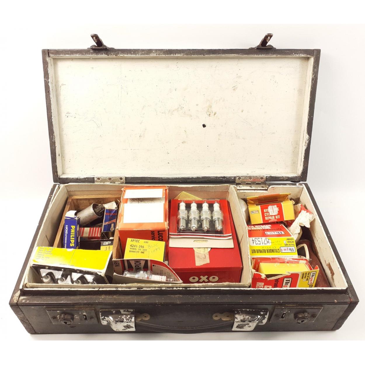 A vintage wooden box full of useful car components to include spark plugs, brake parts, light bulbs etc - this belonged to a British Leyland MG owner enthusiast