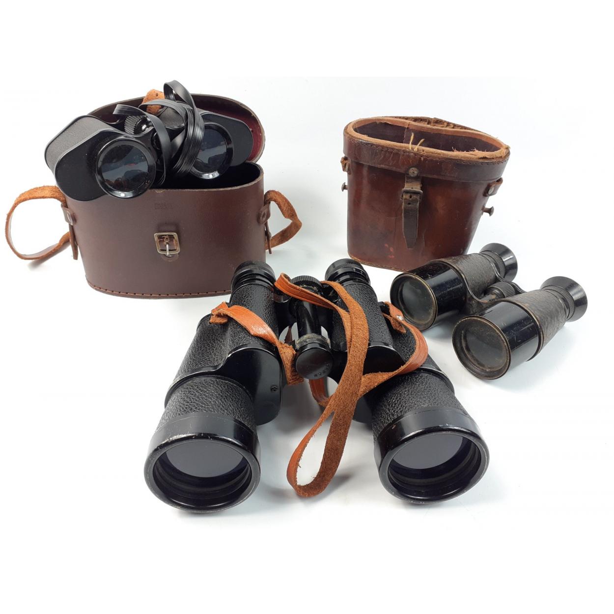 Three sets of binoculars to include TOHYOH 12-50 requiring cleaning - condition good lenses, one older pair in poor condition
