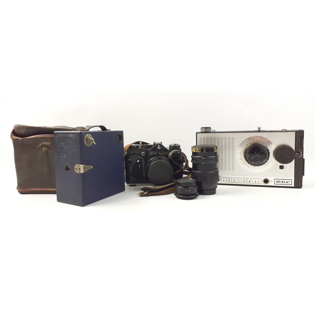 A ZENIT TTL camera with Helios lens, a basic box Brownie, a GEC transistomatic radio camera, and 2 lenses