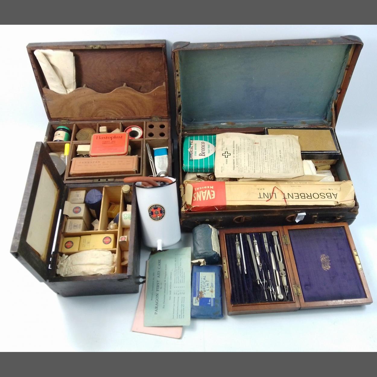 Three vintage wooden medical kits, one marked PARAGON with vintage contents to include bandages, hypodermics etc, also an enamel cup etc