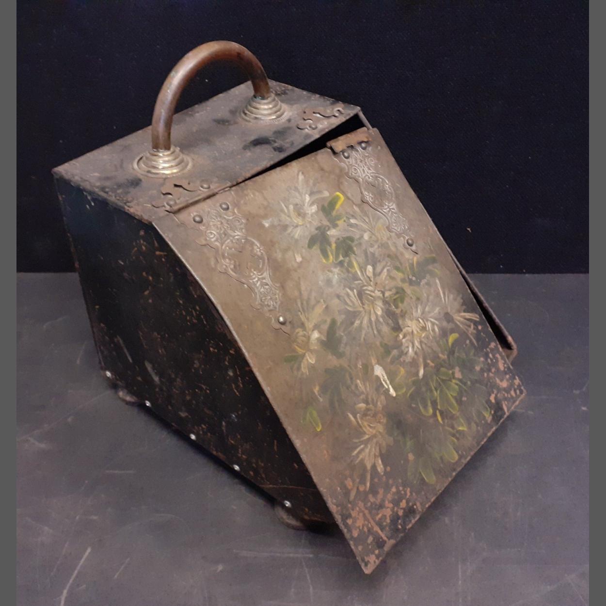 A metal coal scuttle with painted floral front cover 27x38x43cm approx