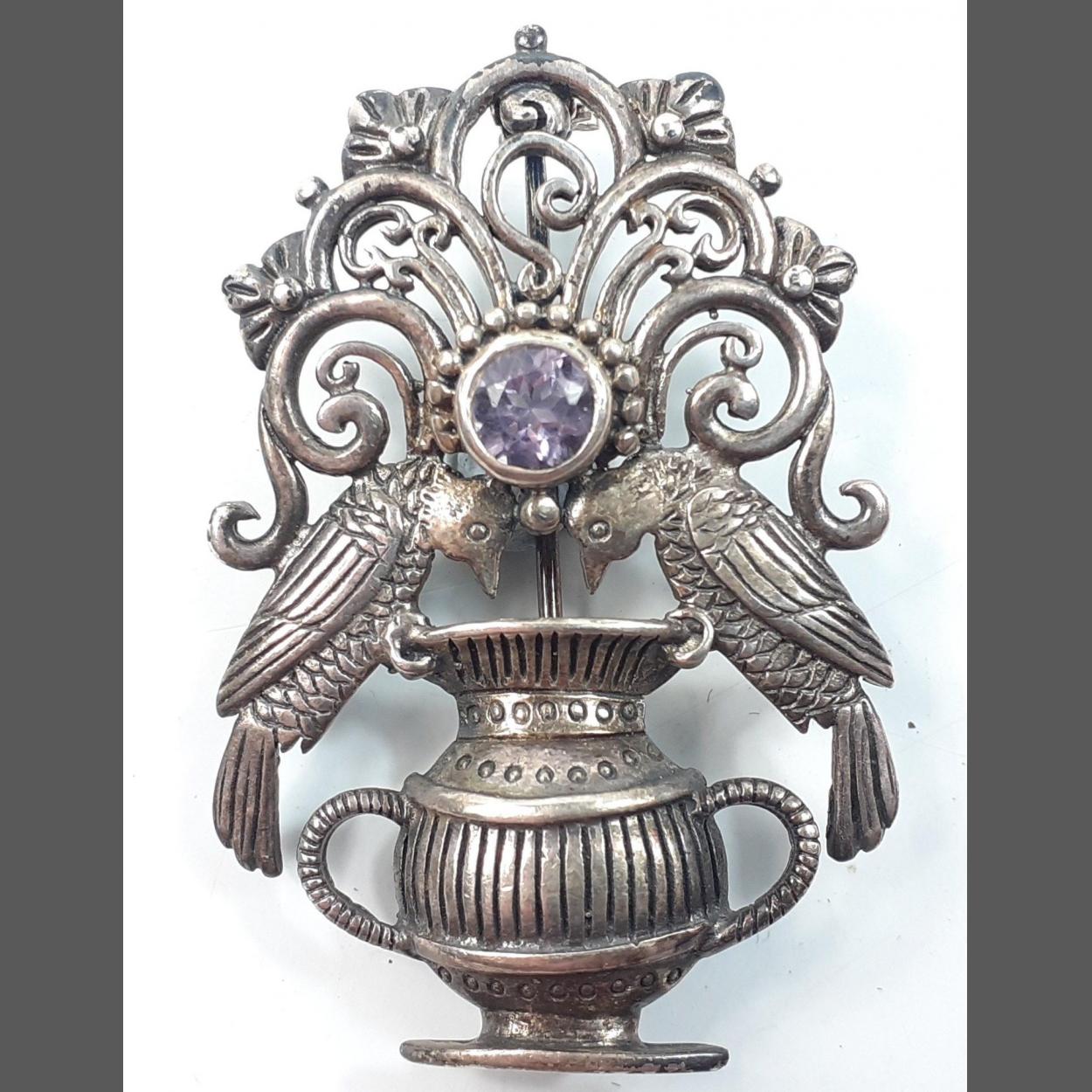 A very pretty vintage 925 stamped brooch with an urn, 2 birds, scroll work and a purple stone, 4cm long gross weight 7g approx