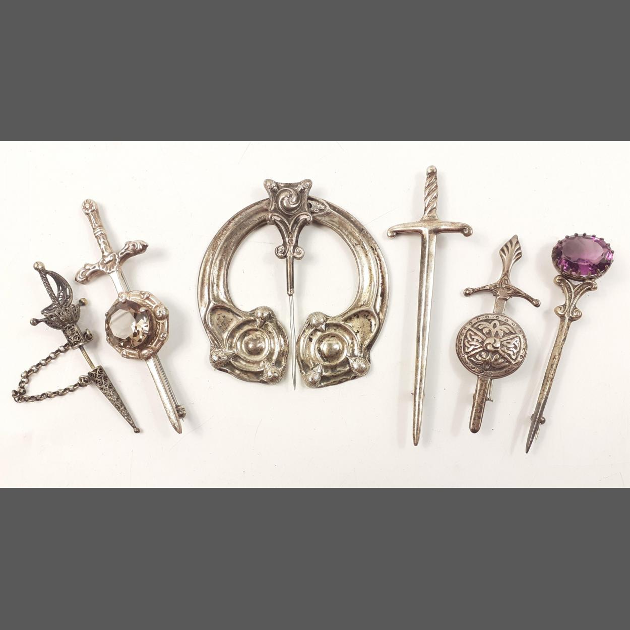 A nice little collection of five silver kilt pins and a torque plaid 7cm dia, gross weight 93g approx