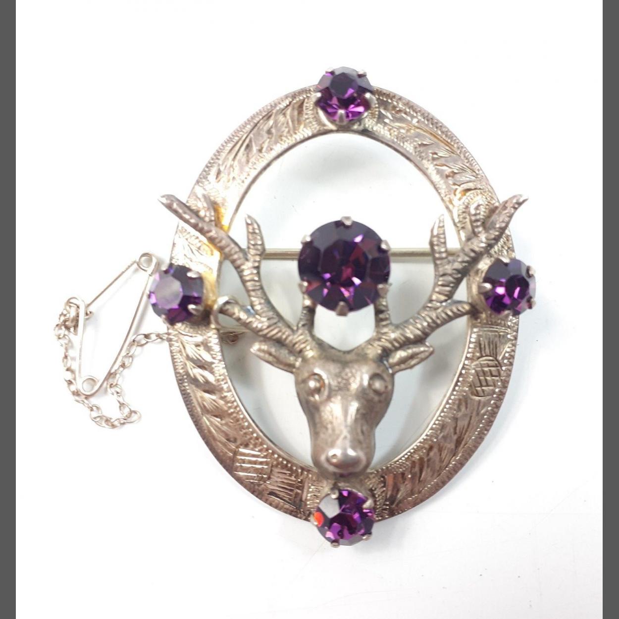 A lovely VINTAGE silver brooch, hallmarked GLASGOW 1954, made by Ward Bros, oval shaped with a stag's head and set with 5 AMETHYST stones and safety chain, 5cm long approx, gross weight 12g approx