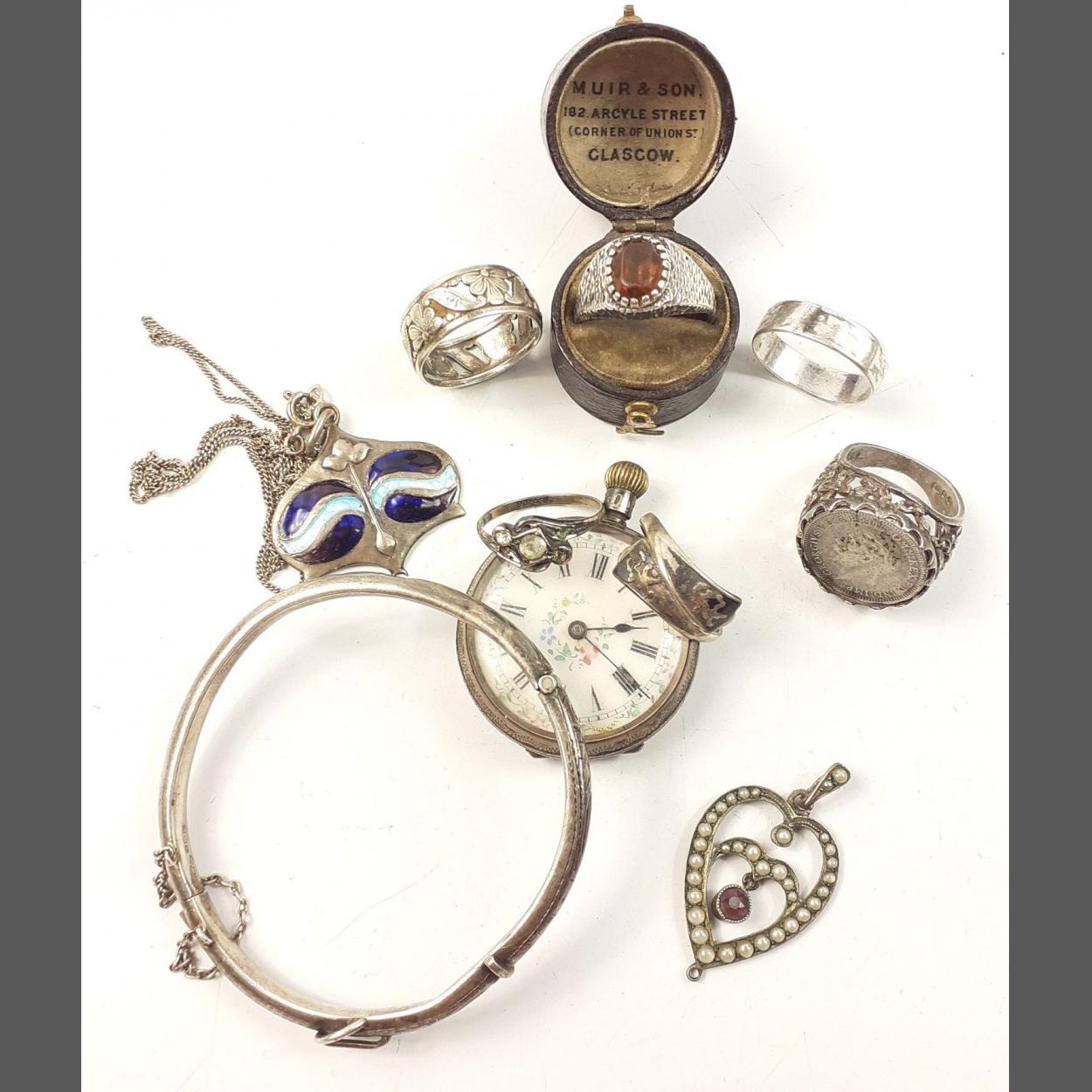 A small silver lot to include a very pretty little case fob watch with floral dial, child's bangle, enamelled pendant, various rings including one in a pretty Muir & Son of Glasgow box, gross weight 55g approx