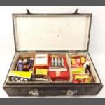 A vintage wooden box full of useful car components to include spark plugs, brake parts, light bulbs etc - this belonged to a British Leyland MG owner enthusiast
