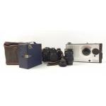 A ZENIT TTL camera with Helios lens, a basic box Brownie, a GEC transistomatic radio camera, and 2 lenses