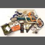 A quantity of blue based costume jewellery including beads, necklaces etc and a cased plated condiment set
