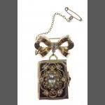 A very pretty decorative 4 panel locket brooch with safety chain suspended from a bow set with a clear stone 5cm long