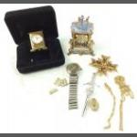 A small lot of costume jewellery and items of interest to include two pretty little gilt clocks, a lovely Maltese cross styled brooch, a plated kilt pin in the shape of a claymore, some gilt spare watch links and a vintage Eterna watch, not currently running etc