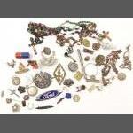 A small mixed lot of jewellery, badges and bijouterie to include base chain with imp medallion, a jet bar brooch, a few military badges, an unmarked propelling pencil and others