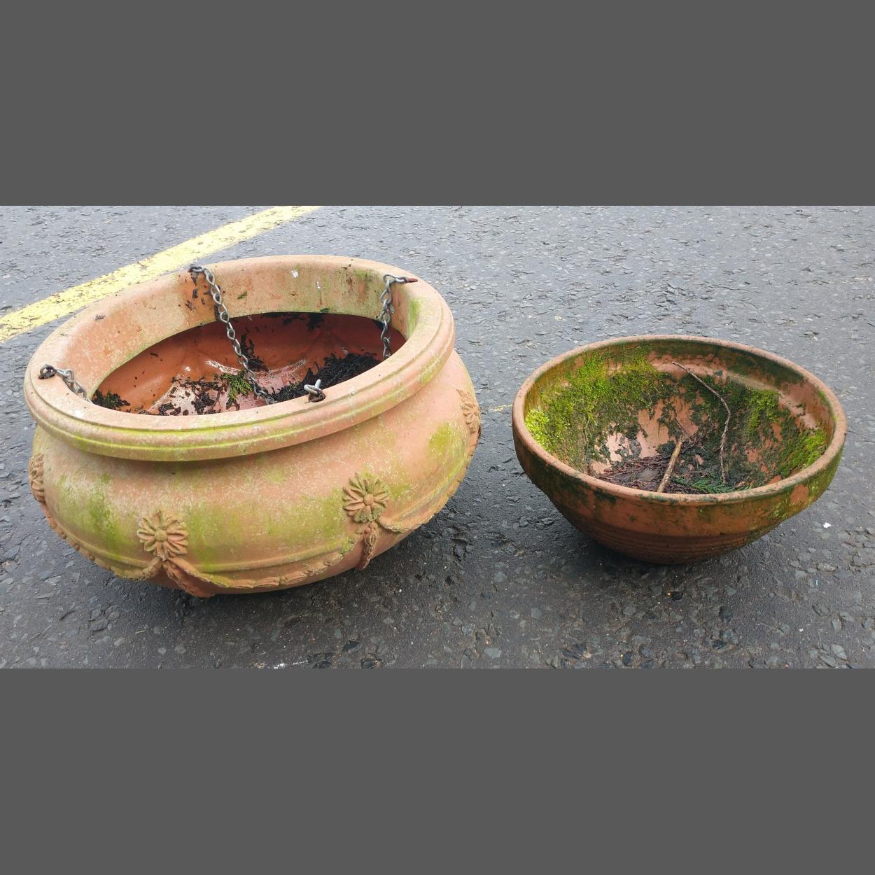 Two garden planters, one a plastic hanging planter and the a other terracotta bowl W43 x H22 x D43cm approx