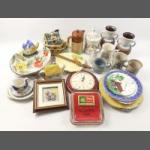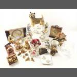 A mixed ornamental box to include Wade whimsies, 2 mantel clocks, a glorious Portuguese pheasant (tail damage repaired)