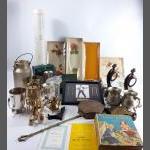 A mixed lot comprising small oil lamps, a large Alexandra bowl on pedestal, plated items, including a quantity of plated flatware, a lockable briefcase, a Ferguson radio, a Myers aluminium table top filing cabinet and a mystery box