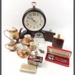 A mixed box to include a part Oriental coffee set, 2 hip flasks, safety razor, a quartz Beesealy mantel clock and boxed child's cutlery set