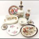 A mixed lot to include 3 sandwich plates, an oval decorative hunting plate by Hanley (30cm long), Oriental style electric lamp base, Oriental vase, 7 Meakin bowls, some Noritake and some commemorative cups