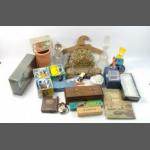 COLLECTABLES! A mixed box to include a substantial wrought candle holder with wine dispenser, UNUSUAL! - a pair of PHILEUS FOGG style balloon bookends with slight damage, an inkwell, a carved wooden pediment and others