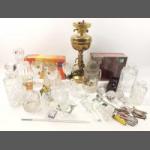 A mixed box of glassware to include St Michael tulip glasses, various decanters, a bier stein and an electrified brass oil lamp etc