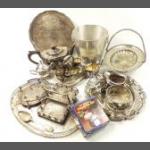 A mixed lot of EPNS to include three galleried trays, a milk jug, a rather lovely stag's head bottle stopper and others