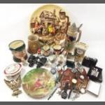 A mixed box to include a Larbert Pottery 1974 limited edition (428/500) BURNS Extra Special tankard, various Toby jugs, a brass eagle-shaped door knocker, a pair of binoculars, watches, decorative china etc