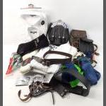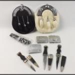 Scottish Highland dress accessories to include a white fur sporran from Heritage of Scotland, Edinburgh, a sporran decorated with the Saltire, a black sporran, an unused sporran belt, 3 belt buckles and 3 sgian dubh