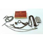 An assorted collection of key fobs and an Albert with indistinct hallmarks (26g approx)