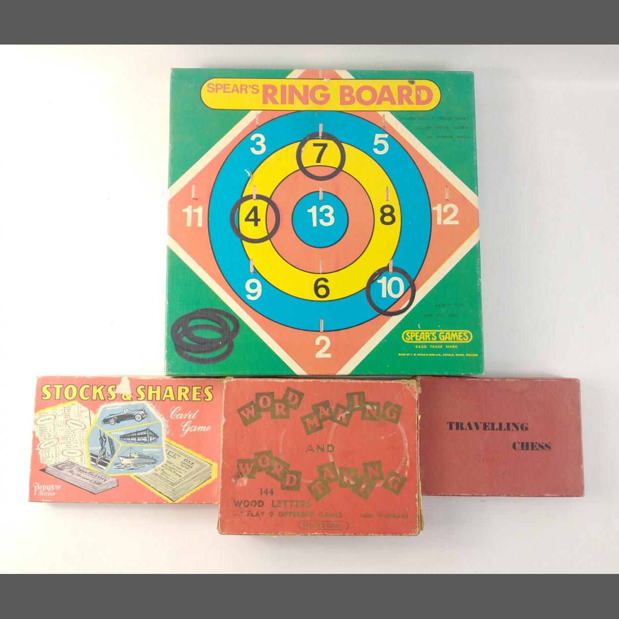 GREAT FUN for family evenings in! Four VINTAGE Board Games to include Travelling Chess, Pepys Stocks & Share Card Game, Spears Word Game and Spears Ring-Throwing Game.