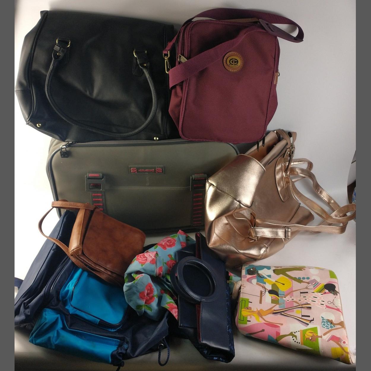 A small selection of bags to include a tan leather crossbody bag, a day bag rucksack, a soft-sided weekend suitcase etc