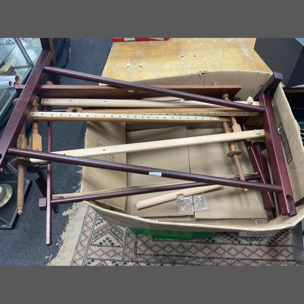A large box to include a hobby frame for tapestry work 90cm length approx