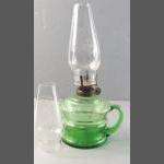 A wee Willie Winkie style green glass antique oil lamp with handle. Standing 25cm tall. With spare funnel.