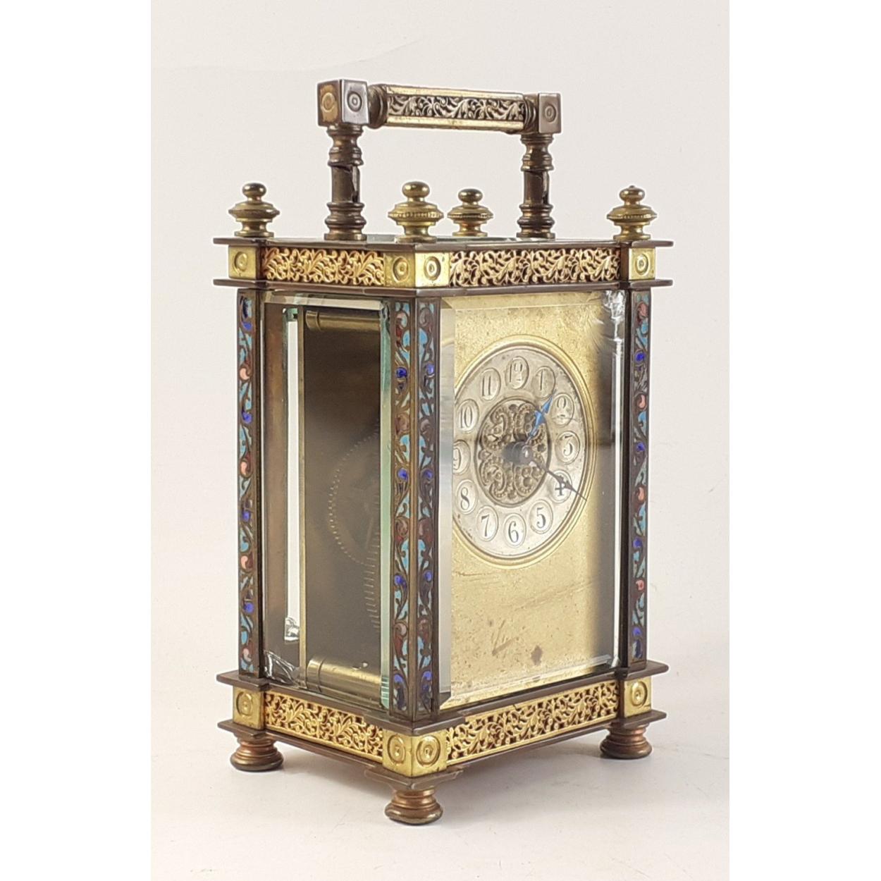 Brass travel carriage clock in case. In full working condition with key. Stands 15cm tall approx. Beautiful enamel side pillars. A gorgeous piece however each of the faceted glass side panels has some damage.